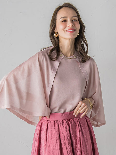 【デザインの特徴】シアー感が上品なケープとノースリーブトップスのアンサンブル。別々にも着用できる汎用性のある一着。スカートにもパンツにも合わせていただきやすい着丈設定にしています。シンプルなボトムとの着こなしを印象的に導くアンサンブルニットです。【素材の特徴】繊細なシアー感天竺組織・光に当たると細かなラメのような微光沢・清涼感のあるドライタッチ。----------------------------------------------------------------洗濯方法家庭洗濯:液温は30℃を限度とし、手洗いができる。自然乾燥:日陰の平干しがよい。アイロン:底面温度120℃を限度としてアイロン仕上げができる。ドライクリーニング:石油系溶剤による弱いドライクリーニングができる。----------------------------------------------------------------■モデル身長 169cm/着用サイズ M※画像の商品はサンプルとなりますので実際の商品と仕様、加工、サイズが若干異なる場合がございます。※お客様のモニター環境により実際のお色と多少異なる場合がございます。※撮影状況や光の当たり具合により、色合いが異なって見える場合がございます。※商品タグに記載されたサイズはヌードサイズです。実際の商品のサイズは商品情報の実寸をご確認ください。関連ワード:Viaggio Blu ビアッジョブルー レディース 新作 大人カジュアル 大人コーデ レディース キレイめ フェミニン エレガント 華やか 上品 春 夏 2025春夏 2025SS 春服 夏服