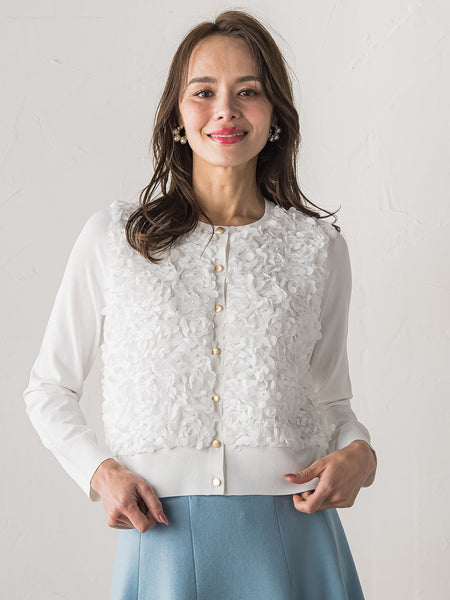 【デザインの特徴】花びらのモチーフを敷き詰めた華やかなドッキングカーディガン。一枚でも羽織としても華やかな印象に導いてくれる一着です。ニット部分は滑らかな肌触りのレーヨンポリエステル素材を使用。コンパクトなサイズ感なので、着膨れせず、上品に装っていただけます。【素材の特徴】花びらの形にヒートカット加工した生地をベースの生地に縫い付けた立体感が魅力的な意匠素材です。軽やかな素材感なので、シーズン問わず、一年を通して着用していただけます。----------------------------------------------------------------洗濯方法家庭洗濯:家庭での洗濯禁止。アイロン:底面温度120℃を限度としてアイロン仕上げができる。ドライクリーニング:石油系溶剤による弱いドライクリーニングができる。----------------------------------------------------------------■モデル身長 169cm/着用サイズ M※画像の商品はサンプルとなりますので実際の商品と仕様、加工、サイズが若干異なる場合がございます。※お客様のモニター環境により実際のお色と多少異なる場合がございます。※撮影状況や光の当たり具合により、色合いが異なって見える場合がございます。※商品タグに記載されたサイズはヌードサイズです。実際の商品のサイズは商品情報の実寸をご確認ください。関連ワード:Viaggio Blu ビアッジョブルー レディース 新作 大人カジュアル 大人コーデ レディース キレイめ フェミニン エレガント 華やか 上品 秋 秋服 2025AW AW 2025秋冬