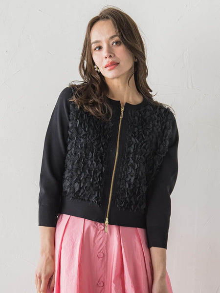【デザインの特徴】一枚で華やかな印象にしてくれる意匠素材とドッキングしたニットブルゾンです。前身頃には、様々な素材をあしらった立体感がポイントの生地を使用し、フロントはメタルの光沢がエレガントなダブルジップを施しています。一枚でも素敵ですが、同じ意匠生地を使用したスカート(2611-61063)を合わせていただくと、セットアップでよりエレガントな印象に。特別な日にもおすすめです。【素材の特徴】テープチュールの刺繍と、シャギーを組み合わせることで、華やかさを際立たせた意匠素材です。華やかで立体的ながらもエアリーなので、シーズンレスで着ていただけます。----------------------------------------------------------------洗濯方法家庭洗濯:液温は30℃を限度とし、手洗いができる。自然乾燥:日陰の平干しがよい。アイロン:底面温度160℃を限度としてアイロン仕上げができる。ドライクリーニング:石油系溶剤による弱いドライクリーニングができる。----------------------------------------------------------------■モデル身長 169cm/着用サイズ M※画像の商品はサンプルとなりますので実際の商品と仕様、加工、サイズが若干異なる場合がございます。※お客様のモニター環境により実際のお色と多少異なる場合がございます。※撮影状況や光の当たり具合により、色合いが異なって見える場合がございます。※商品タグに記載されたサイズはヌードサイズです。実際の商品のサイズは商品情報の実寸をご確認ください。関連ワード:Viaggio Blu ビアッジョブルー レディース 新作 大人カジュアル 大人コーデ レディース キレイめ フェミニン エレガント 華やか 上品 秋 秋服 2025AW AW 2025秋冬
