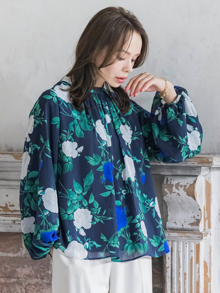 透け感のある軽やかなシアー素材に、エレガントなブルーのローズプリントを施した、華やかさあふれるビッグリボンブラウス。