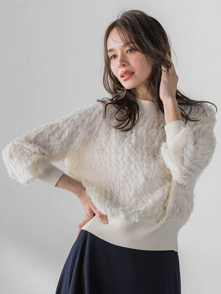 身頃には、シアー素材に様々な素材を乗せた意匠性の高い生地を使用。