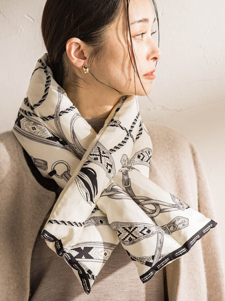 【デザイン】スカーフで親しまれるビットや馬具モチーフを取り入れた、クラシカルなデザインのダウンマフラー。ニューメキシコ・チマヨ村に伝わるオルテガ柄を組み合わせ、ネイティブ感のある雰囲気に仕上げています。さらに、全体をモノトーン調にまとめることで、大人らしい上品さと洗練された印象をプラスしました。コーディネートのアクセントとしてはもちろん、防寒性と軽さを兼ね備えた実用性の高いアイテムです。【ブランド紹介】manipuri(マニプリ)は、2009年にスタートしたスカーフブランド。ヴィンテージスカーフからインスピレーションを受け、素材やサイズ感にこだわり、どんな巻き方でも美しく見えるよう緻密に計算されたデザインが特徴です。職人の手作業による手捺染(ハンドプリント)で一枚ずつ丁寧に仕上げられるスカーフやストールは、まるで絵画を身につけているかのよう。バッグや傘、ウェアにも展開を広げ、豊かな色彩とデザイン性でファッションに新しい楽しさを与え続けています。