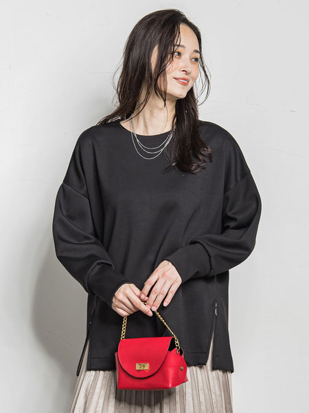 【デザイン】シンプルながら、サイドのファスナーディテールでスタイリングに変化をつけられるプルオーバー。ゆったりとしたシルエットで、気になる体のラインを拾わずリラクシーな着心地。ファスナーを開けるとスリットのようになり、インナーやレイヤードをさりげなく見せられる仕様です。首元は後ろにコンシールファスナーを配し、すっきりとした印象に。オン・オフどちらにも対応できる万能アイテムです。【素材】ふくらみ感とハリを兼ね備えたTRダンボール素材を使用。ストレッチ性がありながら軽く、シワになりにくいのが嬉しいポイント。さらりとした肌触りで、シーズンを通して快適に着られます。【仕様】裏地なし首元後ろコンシールファスナーあきサイドファスナー開閉可能