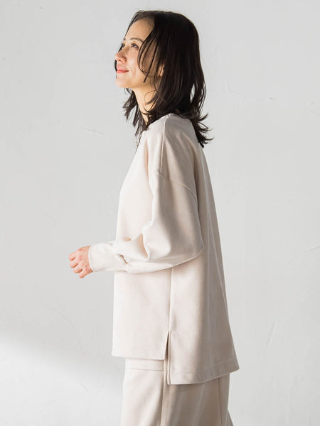 【デザイン】フェイクスエード素材を使用したプルオーバー。前後差のある着丈で、着るだけでこなれた印象に仕上がるデザイン。背中には縦にステッチを入れ、シンプルながらポイントのある表情にしています。袖口とネック後ろはリブ仕様で、ほどよいカジュアル感と着心地の良さを両立。ゆったりめのシルエットで体のラインを拾いにくく、インナーとしても一枚着としても使いやすいアイテムです。同素材のスカートと合わせてセットアップでの着こなしも可能です。【素材】柔らかな質感のフェイクスエード素材を使用。ストレッチ性があり、動きやすく快適な着心地です。【仕様】裏地なし