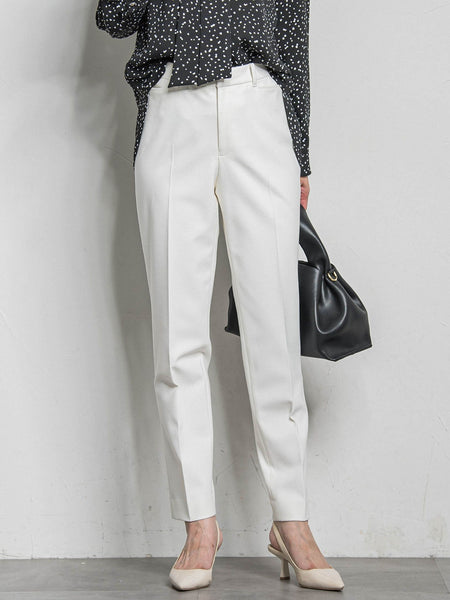 ウエストから足首にかけて自然にシェイプしたラインと、中央のプレスが縦のラインを強調し、脚長効果を発揮します。