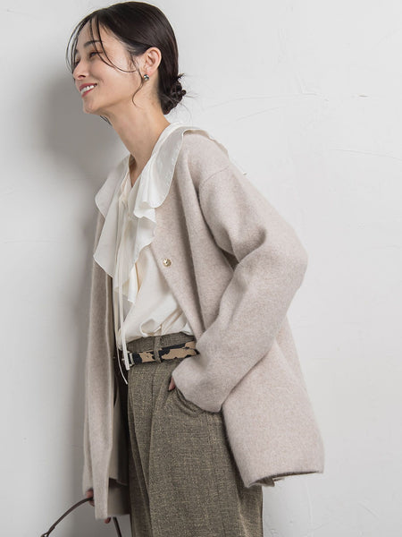 【デザイン】ふんわりとした毛足感が上品な印象を与えるニットジャケット。コートほど重たくなく、カーディガン以上にきちんと見える絶妙なアイテムです。シンプルなシルエットで羽織るだけで大人の雰囲気を演出し、オンオフ問わず活躍します。【素材】表側にはフォックス混の上品なヘアリー素材を使用。裏側は形態安定性に優れたポリエステルを用いており、軽さと暖かさを両立。接結編みにすることで、裏側に毛羽が出にくく、インナーへの毛羽付着を軽減する仕様になっています。【スタイリング】ブラウスやワンピースにさらりと羽織れば、女性らしい柔らかな印象に。パンツスタイルと合わせてもきれいめにまとまり、日常から通勤シーンまで幅広く対応できます。----------------------------------------------------------------洗濯方法家庭洗濯:液温は30℃を限度とし、手洗いができる。自然乾燥:日陰の平干しがよい。アイロン:底面温度120℃を限度としてアイロン仕上げができる。ドライクリーニング:石油系溶剤による弱いドライクリーニングができる。----------------------------------------------------------------■モデル身長 165cm/着用サイズ 9号※商品タグに記載されたサイズはヌードサイズです。実際の商品のサイズは商品情報の実寸をご確認ください。※画像の商品はサンプルとなりますので実際の商品と仕様、加工、サイズが若干異なる場合がございます。※お客様のモニター環境により実際のお色と多少異なる場合がございます。※撮影状況や光の当たり具合により、色合いが異なって見える場合がございます。関連ワード:LAUTREAMONT ロートレアモン レディース きれいめカジュアル 大人カジュアル ナチュラル きれいめ キレイめ 上品 シンプル ベーシック 通勤スタイル オフィスカジュアル キャリア オフィススタイル 新作 2025秋冬 2025AW 秋冬 秋物 秋服