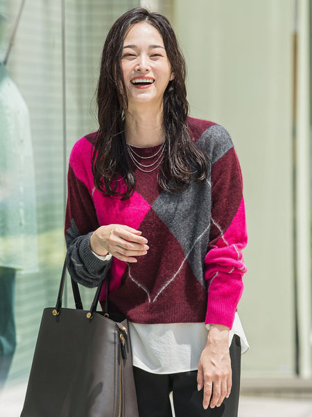 クラシックなアーガイル柄をモダンにアレンジした一枚。ラクーン混の素材を使用することで上質感が加わり、ヘアリーな表情が上品な印象を演出します。コンパクトな丈感で軽やかさもプラスされ、スカートにもパンツにも合わせやすいバランスです。