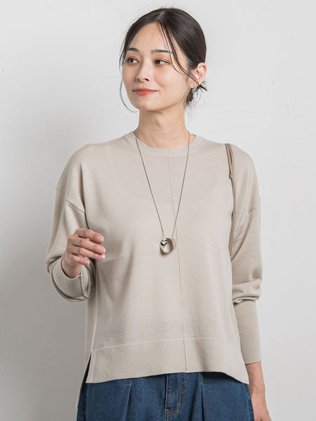 【デザイン】シンプルながらも上品な印象のクルーネックプルオーバーニット。前身頃の中央に施したラインデザインがさりげないアクセントになっています。ゆとりのあるシルエットで体のラインを拾いにくく、デイリーに着やすいバランス感。裾にはサイドスリットを入れ、アウトで着ても軽やかさのある仕上がりです。【素材】ウール100%の上質なニット素材を使用。ふんわりと柔らかく、保温性にも優れているため、秋冬シーズンに快適な着心地です。ウールならではの自然な光沢感とソフトな風合いが魅力です。