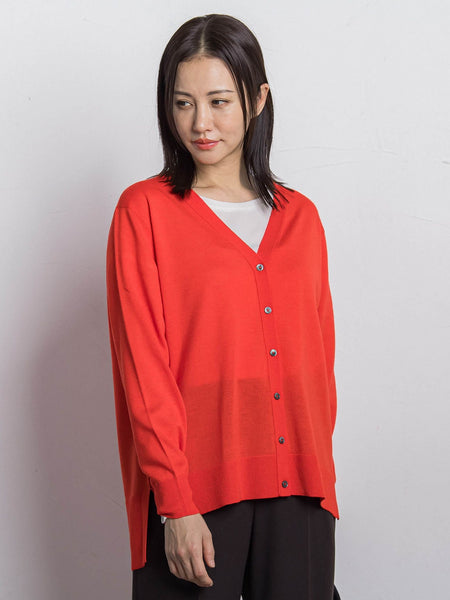 前立てのボタンがアクセントになり、1枚着や肩掛け、ツインセットなど幅広い着こなしを楽しめます。