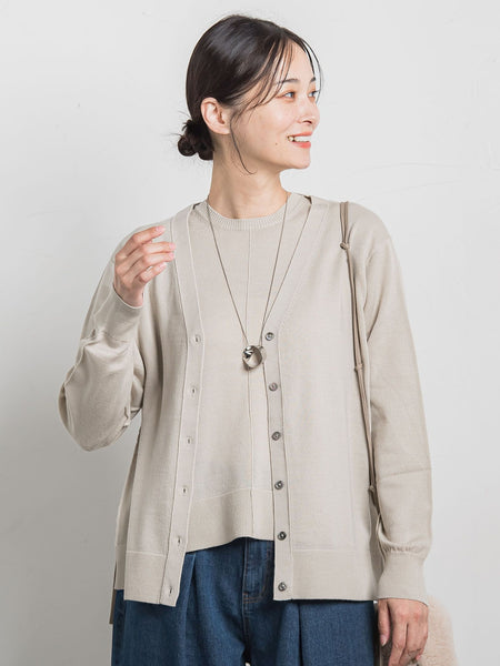 【デザイン】シンプルでベーシックなクルーネックカーディガン。コンパクトなサイジングながらもリラクシーに羽織れるシルエットで、さまざまなスタイリングに合わせやすいデザインです。前立てのボタンがアクセントになり、1枚着や肩掛け、ツインセットなど幅広い着こなしを楽しめます。【素材】毛100%の上質な糸を使用。ナチュラルな光沢と柔らかな風合いが特徴で、さらりとした肌触りで快適に着ていただけます。程よい厚みと軽さを両立し、秋から春先までロングシーズン活躍します。同素材のプルオーバー(3192-57007)とのツインセットスタイリングもおすすめです。