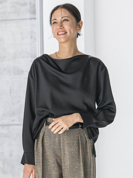 【デザイン】上品な光沢が魅力のサテンライク素材を使用した長袖ブラウス。ほどよい艶感で、華やかさがありながらも派手になりすぎず、落ち着いた大人の印象に仕上げています。柔らかくさらっとした肌触りで、長時間の着用でも快適。一枚で着るのはもちろん、ジャケットやカーディガンのインナーとしても合わせやすい万能アイテムです。お家で手洗いできるのも嬉しいポイント。----------------------------------------------------------------洗濯方法家庭洗濯:液温は40℃を限度とし、手洗いができる。自然乾燥:日陰の吊り干しがよい。アイロン:底面温度160℃を限度としてアイロン仕上げができる。ドライクリーニング:石油系溶剤による弱いドライクリーニングができる。----------------------------------------------------------------■モデル身長 165cm/着用サイズ 9号※商品タグに記載されたサイズはヌードサイズです。実際の商品のサイズは商品情報の実寸をご確認ください。※画像の商品はサンプルとなりますので実際の商品と仕様、加工、サイズが若干異なる場合がございます。※お客様のモニター環境により実際のお色と多少異なる場合がございます。※撮影状況や光の当たり具合により、色合いが異なって見える場合がございます。関連ワード:LAUTREAMONT ロートレアモン レディース きれいめカジュアル 大人カジュアル ナチュラル きれいめ キレイめ 上品 シンプル ベーシック 通勤スタイル オフィスカジュアル キャリア オフィススタイル 新作 2025秋冬 2025AW 秋冬 秋物 秋服