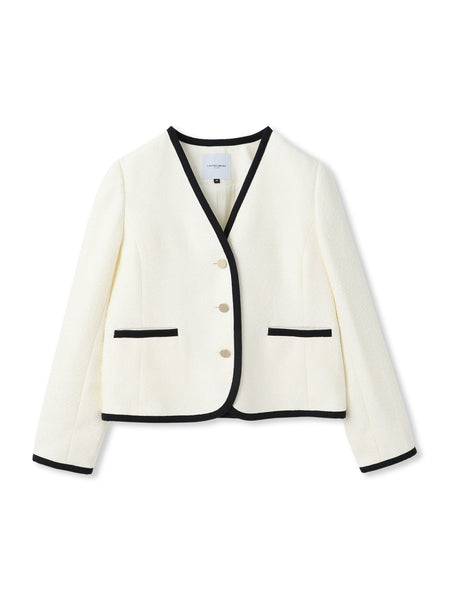 【デザイン】程良くコンパクトなサイズ感のノーカラージャケットです。ホワイトにはブラック、ネイビーにもブラックのパイピングテープをあしらい、クラシカルな印象に仕上げています。ポケットも配色にし、シャープにしています。フロントはゴールドのメタルボタンで華やかな印象です。デイリーユースでも、少しフォーマルな場面でも、様々なスタイリングをしていただけます。総裏付きなので、着心地もスムーズで快適です。【素材】天然糸のような形状をしたポリエステル融着糸を経糸に使用し、緯糸にレーヨンのリング糸を打つことで、光沢があり、表情感がありながら、軽くソフトなツイード素材に仕上げています。ポリエステル特有の落ち感と、レーヨンリングの光沢と表情感が特徴です。綾目の組織がシャープでエレガントな印象です。----------------------------------------------------------------洗濯方法家庭洗濯:家庭での洗濯禁止。アイロン:底面温度160℃を限度としてアイロン仕上げができる。ドライクリーニング:石油系溶剤による弱いドライクリーニングができる。----------------------------------------------------------------※商品タグに記載されたサイズはヌードサイズです。実際の商品のサイズは商品情報の実寸をご確認ください。※画像の商品はサンプルとなりますので実際の商品と仕様、加工、サイズが若干異なる場合がございます。※お客様のモニター環境により実際のお色と多少異なる場合がございます。※撮影状況や光の当たり具合により、色合いが異なって見える場合がございます。関連ワード:LAUTREAMONT DE CLASSE ロートレアモンデュクラス レディース きれいめカジュアル 大人カジュアル ナチュラル きれいめ キレイめ 上品 シンプル ベーシック 通勤スタイル オフィスカジュアル キャリア オフィススタイル 新作 2025春夏 2025SS 春夏 夏物 夏服