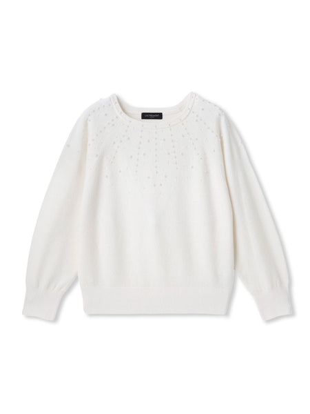 ネックラインに大小さまざまなパールをあしらった華やかなニットプルオーバー。