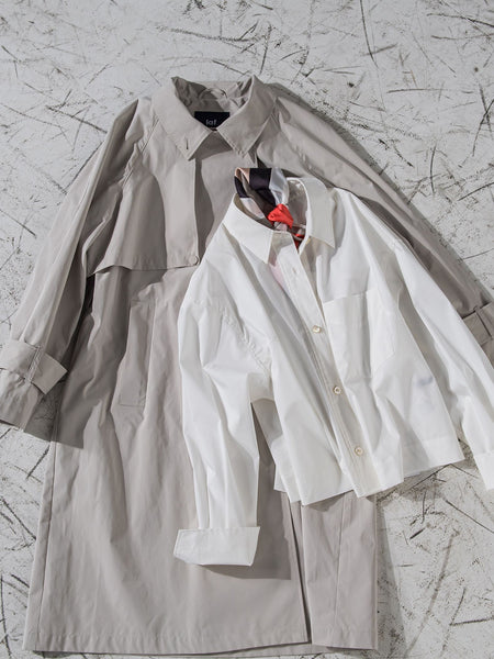 【デザインの特徴】トレンチ風デザインを釦が目立ちにくいスッキリとしたシンプルなデザインにアレンジし、どんなテイストにも合わせていただきやすくしております。胸と背中の二枚重ねのケープ風デザインが華やかな印象に。襟を立てて釦を閉じるとスタンドカラー、開くとステンカラーの2way仕様。ラグランスリーブで寒い日には厚手のニットを着込むことができます。気分に合わせて共地ベルトでウエストマークしてシルエット変化を楽しんでいただけます。