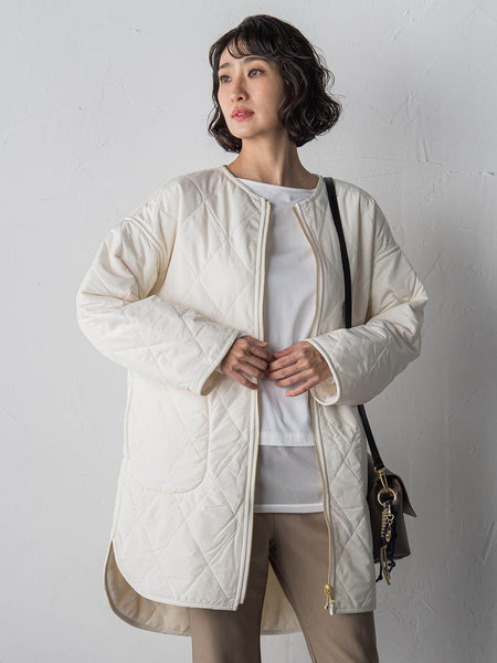 軽やかなタフタと、ふんわりとしたファーを組み合わせたリバーシブル仕様のキルトジャケット。表情の異なる素材感をその日の気分やシーンに合わせて使い分けられるのが魅力です。タフタ面はすっきりとスポーティに、ファー面はウォーム感たっぷりにと、まったく違った印象を楽しめる一着。キルトの程よいボリュームが体を包み込み、軽やかな着心地ながらしっかり暖かいのもポイントです。デイリーからお出かけまで活躍する、冬のワードローブに頼れるジャケットです。重さ:865g