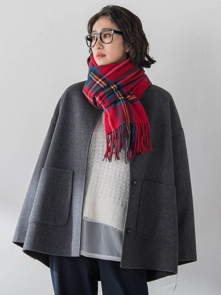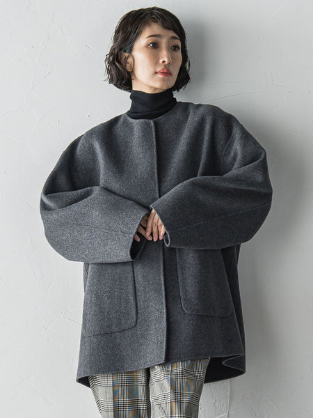 【デザインの特徴】質感高い二重織のウール素材を贅沢に用い、リバー仕立てで仕上げたノーカラーコート。リバーコートにはめずらしい裏地付きで、着心地の良さと着脱のしやすさを両立しました。大きめのポケットがポイントになり、シンプルなシルエットにさりげない可愛らしさをプラス。ハーフレングスのバランスが軽やかで、抜け感のある女性らしい印象に導きます。羽織るだけで雰囲気が決まり、きちんと感もデイリー感も楽しめる一着です。【素材の特徴】オーストラリア産タスマニア原料のスーパー140ウールとスーパー120ウールをブレンドした非常に上質なウールを使用。しなやかな滑り感とソフトなタッチ、上質な光沢感を兼ね備えたウールリバー素材になります。生地一枚でコートを仕上げることができるため、軽さを実現しつつ、生地と生地を接結したリバー素材であるがゆえの(生地と生地の間に空気の層をつくることができる)温かさももちあわせた製品に仕上がっています。必要な部分にふらして裏地を使用することにより、リバーコート特有の袖通りの悪い着用のしにくさを解消した製品となっております。----------------------------------------------------------------洗濯方法家庭洗濯:家庭での洗濯禁止。アイロン:底面温度160℃を限度としてアイロン仕上げができる。ドライクリーニング:石油系溶剤による弱いドライクリーニングができる。----------------------------------------------------------------※画像の商品はサンプルとなりますので実際の商品と仕様、加工、サイズが若干異なる場合がございます。※お客様のモニター環境により実際のお色と多少異なる場合がございます。※撮影状況や光の当たり具合により、色合いが異なって見える場合がございます。※商品タグに記載されたサイズはヌードサイズです。実際の商品のサイズは商品情報の実寸をご確認ください。関連ワード:la.f… ラ エフ レディース 新作 大人コーデ シンプル フォーマル モード マニッシュ 2025秋冬 2025AW 秋冬 秋物 秋服