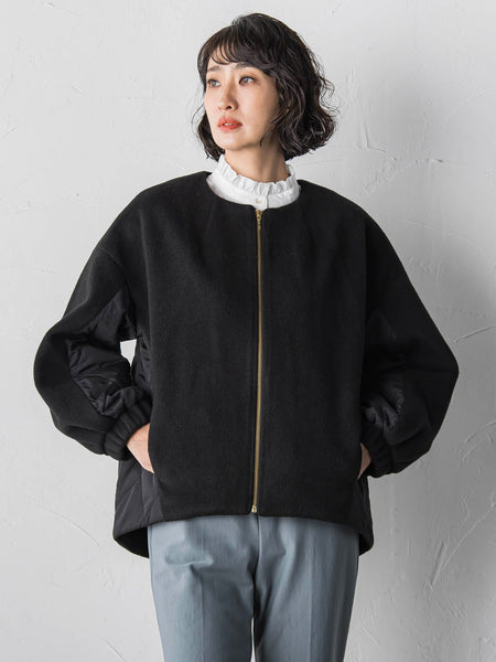 【デザインの特徴】ウールライクなシャギー素材とキルティングタフタをドッキングさせた、表情豊かなノーカラーブルゾン。ふんわりとしたシャギーのあたたかみと、タフタキルティングの軽やかさが調和し、カジュアルながらも洗練された印象に仕上がります。ノーカラーのすっきりとした首まわりは、タートルやストールとのレイヤードも楽しめ、幅広い着こなしに対応。軽やかな着心地でデイリーに活躍しつつ、異素材のコンビネーションがコーディネートに奥行きを添えてくれる、大人のための新鮮なブルゾンです。----------------------------------------------------------------洗濯方法家庭洗濯:家庭での洗濯禁止。アイロン:アイロン仕上げ禁止。ドライクリーニング:石油系溶剤による弱いドライクリーニングができる。----------------------------------------------------------------※画像の商品はサンプルとなりますので実際の商品と仕様、加工、サイズが若干異なる場合がございます。※お客様のモニター環境により実際のお色と多少異なる場合がございます。※撮影状況や光の当たり具合により、色合いが異なって見える場合がございます。※商品タグに記載されたサイズはヌードサイズです。実際の商品のサイズは商品情報の実寸をご確認ください。関連ワード:la.f… ラ エフ レディース 新作 大人コーデ シンプル フォーマル モード マニッシュ 2025秋冬 2025AW 秋冬 秋物 秋服