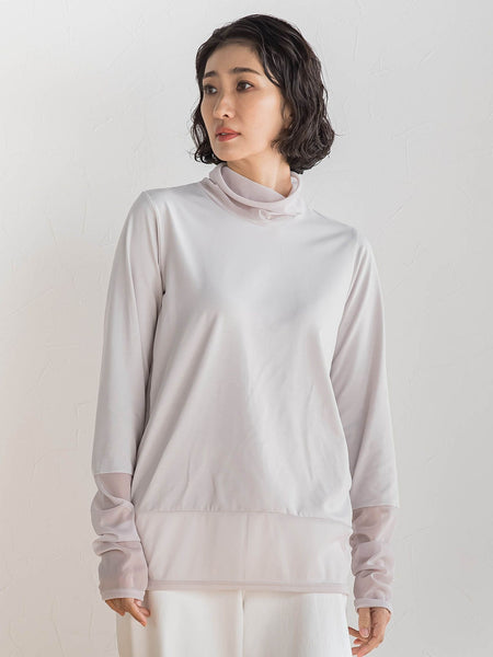 【デザインの特徴】襟・袖口・裾にシアー素材をあしらった、インナーハイネックのカットソー。繊細な透け感がコーディネートに軽やかさを添え、女性らしい雰囲気を引き立てます。身頃部分は透けにくい素材を使用しているため、一枚で着ても安心。ニットやジャケットのインナーとしてはもちろん、シアーディテールを見せてスタイリングのアクセントにするのもおすすめです。シンプルながらニュアンスのある仕上がりで、デイリーにも特別な日にも活躍する万能トップスです。【機能性】◆Easy Careご自宅でのお手入れが簡単◆ストレッチ性【素材の特徴】身頃生地は毛羽の少ない、強度や糸のまとまりが向上するサイロ糸を使用した非常によく伸びるストレッチ天竺素材です。さらにシルケット加工を施し毛羽を極限までそぎ落とすことで、艶やかで上品な表面感を実現しています。部分使いのシアー素材は、布帛のジョーゼット素材のような表面感を出したトリコット素材を使用し、適度な透け感とストレスフリーな着心地を実現しています。----------------------------------------------------------------洗濯方法家庭洗濯:液温は30℃を限度とし、洗濯機で非常に弱い洗濯ができる。自然乾燥:日陰の吊り干しがよい。アイロン:底面温度120℃を限度としてアイロン仕上げができる。ドライクリーニング:石油系溶剤による弱いドライクリーニングができる。----------------------------------------------------------------※画像の商品はサンプルとなりますので実際の商品と仕様、加工、サイズが若干異なる場合がございます。※お客様のモニター環境により実際のお色と多少異なる場合がございます。※撮影状況や光の当たり具合により、色合いが異なって見える場合がございます。※商品タグに記載されたサイズはヌードサイズです。実際の商品のサイズは商品情報の実寸をご確認ください。関連ワード:la.f… ラ エフ レディース 新作 大人コーデ シンプル フォーマル モード マニッシュ 2025秋冬 2025AW 秋冬 秋物 秋服
