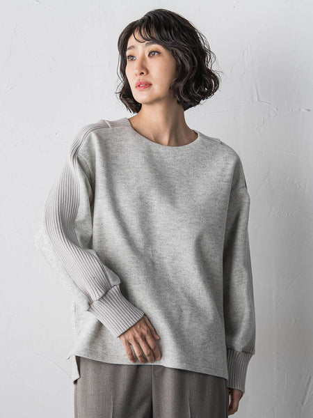 ウールを使わずに仕立てた、なめらかな圧縮ジャージー素材のカットソー。ほどよいハリと温かみがあり、着心地は軽やか。配色のニットをドッキングさせたデザインが、シンプルな中に印象的な表情を添えます。一枚でスタイリングが決まる主役トップスとして、秋冬の装いにおすすめです。