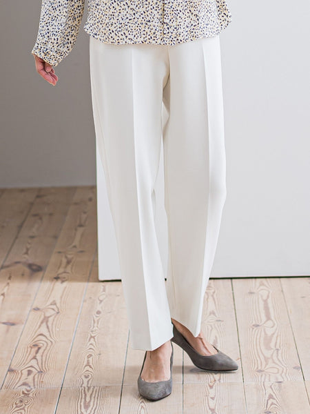 センタープレスを効かせたストレートシルエットは、脚をすっきり美しく見せつつ、きちんと感をプラス。
