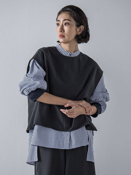 【デザインの特徴】前後どちらでも着用できる2way仕様のクロップドジレ。プルオーバーとしてシンプルに、または前を釦あきにして羽織り感覚で使えるデザインです。フレンチスリーブで肩まわりはゆったりとしつつ、全体は程よいリラックス感を持たせたシルエットに仕上げました。丈はクロップド丈で、ハイウエストボトムとも相性抜群。トップスとのレイヤードスタイルに軽やかさを添え、大人のカジュアルにさりげないアクセントを加えます。季節の変わり目に重宝する万能アイテムです。【機能性】◆Easy Careご自宅でのお手入れが簡単【素材の特徴】とろみ素材にピーチタッチを加え柔らかで非常に肌触りのよい素材です。肉感が薄くドレープ性があり着用期間が長く、レーヨン高混率のため合繊よりも吸放湿性に優れ衣服内を快適に保ちます。----------------------------------------------------------------洗濯方法家庭洗濯:液温は30℃を限度とし、洗濯機で非常に弱い洗濯ができる。自然乾燥:日陰の吊り干しがよい。アイロン:底面温度160℃を限度としてアイロン仕上げができる。ドライクリーニング:石油系溶剤による弱いドライクリーニングができる。----------------------------------------------------------------※画像の商品はサンプルとなりますので実際の商品と仕様、加工、サイズが若干異なる場合がございます。※お客様のモニター環境により実際のお色と多少異なる場合がございます。※撮影状況や光の当たり具合により、色合いが異なって見える場合がございます。※商品タグに記載されたサイズはヌードサイズです。実際の商品のサイズは商品情報の実寸をご確認ください。関連ワード:la.f… ラ エフ レディース 新作 大人コーデ シンプル フォーマル モード マニッシュ 2025秋冬 2025AW 秋冬 秋物 秋服