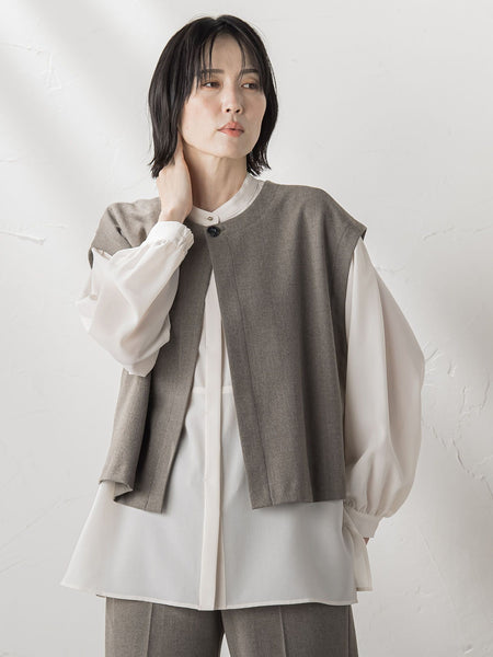 【デザインの特徴】前後どちらでも着用できる2way仕様のクロップドジレ。プルオーバーとしてシンプルに、または前を釦あきにして羽織り感覚で使えるデザインです。フレンチスリーブで肩まわりはゆったりとしつつ、全体は程よいリラックス感を持たせたシルエットに仕上げました。丈はクロップド丈で、ハイウエストボトムとも相性抜群。トップスとのレイヤードスタイルに軽やかさを添え、大人のカジュアルにさりげないアクセントを加えます。季節の変わり目に重宝する万能アイテムです。【機能性】◆Easy Careご自宅でのお手入れが簡単【素材の特徴】ラエフブランドオリジナルの織り、整理ともに尾州産地で仕上げた着用感抜群の2WAYストレッチ素材になります。タテヨコ糸ともに通常より高密度の規格で織り上げ、仕立て映えの良さと着用時の安心感を生み出し、整理加工においても生地を縮ませ通常の2WAYに比べより人の動きに呼応すべくタテ伸び重視で仕上げたハイパワーストレッチになります。こだわりの両面起毛により、ソフトで肌触りの良い素材感を実現。今シーズンのシロは経糸、緯糸ともにフルダルの糸を使用し従来よりもより透けにくい素材となっております。洗濯機で洗えるイージーケアも嬉しいポイント。また生地の表裏、両面にマイクロピーチ加工を施し、風合いに温かみがあり、非常に肌触りのよい製品に仕上がっています。----------------------------------------------------------------洗濯方法家庭洗濯:液温は30℃を限度とし、洗濯機で非常に弱い洗濯ができる。自然乾燥:日陰の吊り干しがよい。アイロン:底面温度120℃を限度としてアイロン仕上げができる。ドライクリーニング:石油系溶剤による弱いドライクリーニングができる。----------------------------------------------------------------※画像の商品はサンプルとなりますので実際の商品と仕様、加工、サイズが若干異なる場合がございます。※お客様のモニター環境により実際のお色と多少異なる場合がございます。※撮影状況や光の当たり具合により、色合いが異なって見える場合がございます。※商品タグに記載されたサイズはヌードサイズです。実際の商品のサイズは商品情報の実寸をご確認ください。関連ワード:la.f… ラ エフ レディース 新作 大人コーデ シンプル フォーマル モード マニッシュ 2025秋冬 2025AW 秋冬 秋物 秋服