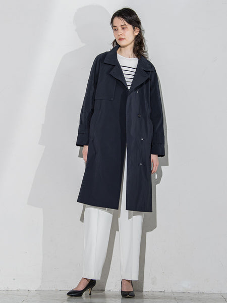 ※撮影の照明により色味が少し異なっている場合がございます。ネイビーとベージュ2色をラックにかけ撮影している画像が実物に近くなっております。ご了承ください。【素材の特徴】リサイクルポリエステルと特殊な加工により、エアリーな質感と深みのある発色性があるシワになりにくい割繊糸を使用した国産のタフタ素材になります。質感のある微起毛タッチが上品さとカジュアルさの両方を兼ね備え、撥水加工も施していますので汎用性あるスプリングコート素材となっております。