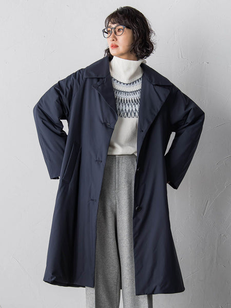 極薄のナイロンタフタにサーモア中綿を包み込んだロングコートは、驚くほどの軽さと暖かさを両立。