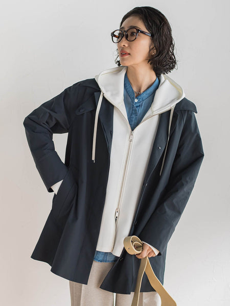 タスランストレッチ素材で仕立てた、軽さと動きやすさが魅力のステンカラーコート。