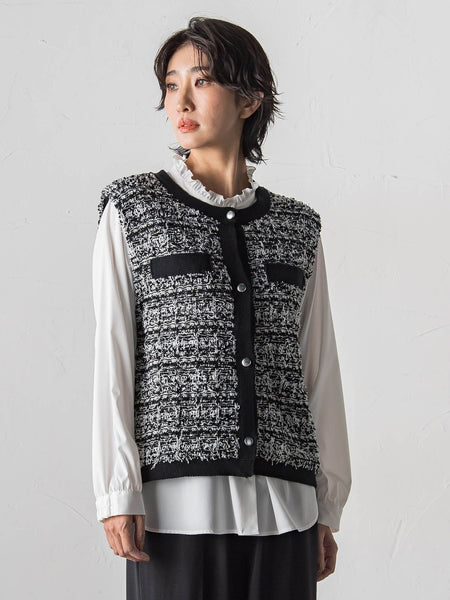 【デザインの特徴】ツイードのように編み立てた表情豊かなニットジレ。軽さのある編地で重たく見えず、さっと羽織るだけでコーデに奥行きが生まれます。ブラウスやカットソーに重ねるだけで上品なニュアンスをプラスでき、季節の変わり目にも活躍する一枚です。----------------------------------------------------------------洗濯方法家庭洗濯:液温は30℃を限度とし、手洗いができる。自然乾燥:日陰の平干しがよい。アイロン:底面温度120℃を限度としてアイロン仕上げができる。ドライクリーニング:石油系溶剤による弱いドライクリーニングができる。----------------------------------------------------------------■モデル身長 164cm/着用サイズ M※画像の商品はサンプルとなりますので実際の商品と仕様、加工、サイズが若干異なる場合がございます。※お客様のモニター環境により実際のお色と多少異なる場合がございます。※撮影状況や光の当たり具合により、色合いが異なって見える場合がございます。※商品タグに記載されたサイズはヌードサイズです。実際の商品のサイズは商品情報の実寸をご確認ください。関連ワード:la.f… ラ エフ レディース 新作 大人コーデ シンプル フォーマル モード マニッシュ 2026春夏 2026SS 春夏 春物 春服