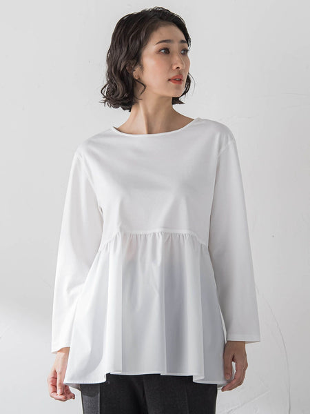 【デザインの特徴】裾にシャツ生地をドッキングしたペプラムデザインが目を惹くカットソー。レイヤードしてももたつかないすっきりデザインで季節を問わず活躍。ニット、カーディガン、パーカーどんなアイテムでも相性抜群です。【機能性】◆Easy Careご自宅でのお手入れが簡単【素材の特徴】コットンとモダールレーヨンを使用した非常に滑らかで肌触りが良く、程よい肉感で透け感も気にすることなく快適に着用していただける素材です。さらにシルケット加工を施すことで上品な光沢感をプラスしております。また布帛部分はポリエステルリッチな綿混ブロードを使用していますので、シワも気にならずイージーケア性にも優れています。----------------------------------------------------------------洗濯方法家庭洗濯:液温は30℃を限度とし、洗濯機で非常に弱い洗濯ができる。自然乾燥:日陰の吊り干しがよい。アイロン:底面温度120℃を限度としてアイロン仕上げができる。ドライクリーニング:石油系溶剤による弱いドライクリーニングができる。----------------------------------------------------------------※画像の商品はサンプルとなりますので実際の商品と仕様、加工、サイズが若干異なる場合がございます。※お客様のモニター環境により実際のお色と多少異なる場合がございます。※撮影状況や光の当たり具合により、色合いが異なって見える場合がございます。※商品タグに記載されたサイズはヌードサイズです。実際の商品のサイズは商品情報の実寸をご確認ください。関連ワード:la.f… ラ エフ レディース 新作 大人コーデ シンプル フォーマル モード マニッシュ 2025秋冬 2025AW 秋冬 秋物 秋服