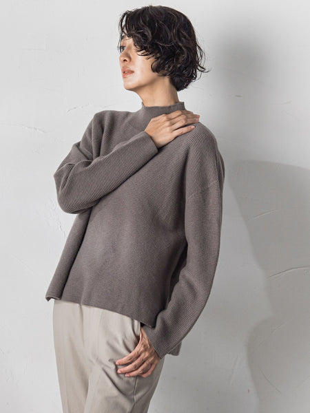 首元をすっきりと見せるハイネックが、品の良いか顔回りを演出します。