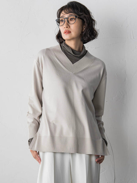 【デザインの特徴】レーヨンの滑らかで心地よい肌触りが魅力のノンウールニット。キレイ目見えしつつカットソー感覚で着用できるうれしいアイテム。身頃が華奢見えする幅広リブのVネック。【機能性】◆Washableご自宅での手洗いが可能----------------------------------------------------------------洗濯方法家庭洗濯:液温は30℃を限度とし、手洗いができる。自然乾燥:日陰の平干しがよい。アイロン:底面温度160℃を限度としてアイロン仕上げができる。ドライクリーニング:石油系溶剤による弱いドライクリーニングができる。----------------------------------------------------------------※画像の商品はサンプルとなりますので実際の商品と仕様、加工、サイズが若干異なる場合がございます。※お客様のモニター環境により実際のお色と多少異なる場合がございます。※撮影状況や光の当たり具合により、色合いが異なって見える場合がございます。※商品タグに記載されたサイズはヌードサイズです。実際の商品のサイズは商品情報の実寸をご確認ください。関連ワード:la.f… ラ エフ レディース 新作 大人コーデ シンプル フォーマル モード マニッシュ 2025秋冬 2025AW 秋冬 秋物 秋服