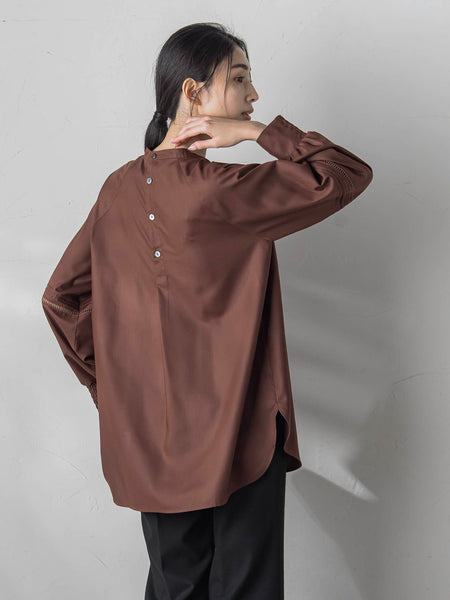 【デザインの特徴】品の良い顔回りを演出するクラシカルなハイネックブラウス。ピンタックとハシゴレースを贅沢にあしらい、取り入れやすいフェミニンな印象がありながら、リッチ感もプラス。やや長めのレングスにしているので、ジレなどのレイヤードインナーとしてもきまりがいい万能な一枚です。【素材の特徴】フルダルのスパンを起毛し、抑えをかけて光沢を出しました。決してふかつくことはなく、サラッとした梳毛ライクの滑らかな手触りでいて、イージーケア。優しい肌触りの素材となっております。----------------------------------洗濯方法家庭洗濯:液温は40℃を限度とし、洗濯機で弱い洗濯ができる。自然乾燥:日蔭の吊り干しがよい。アイロン:底面温度150℃を限度としてアイロン仕上げができる。ドライクリーニング:石油系溶剤による弱いドライクリーニングができる。----------------------------------■モデル1 身長 173cm/着用サイズ 9号■モデル2 身長 171cm/着用サイズ 9号※画像の商品はサンプルとなりますので実際の商品と仕様、加工、サイズが若干異なる場合がございます。※お客様のモニター環境により実際のお色と多少異なる場合がございます。※撮影状況や光の当たり具合により、色合いが異なって見える場合がございます。※商品タグに記載されたサイズはヌードサイズです。実際の商品のサイズは商品情報の実寸をご確認ください。関連ワード:la.f… ラ エフ 2024秋冬 2024AW 冬 冬服 ブラウス ポリエステル クルーネック 無地 長袖 シンプル フォーマル モード マニッシュ インナー ハイネック