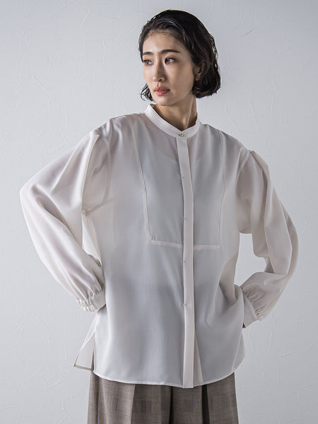 フロントヨークが程よいアクセントになった、バンドカラーデザインの長袖シャツ。