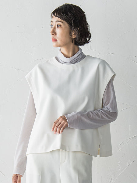 【デザインの特徴】前後どちらでも着用できる2way仕様のクロップドジレ。プルオーバーとしてシンプルに、または前を釦あきにして羽織り感覚で使えるデザインです。フレンチスリーブで肩まわりはゆったりとしつつ、全体は程よいリラックス感を持たせたシルエットに仕上げました。丈はクロップド丈で、ハイウエストボトムとも相性抜群。トップスとのレイヤードスタイルに軽やかさを添え、大人のカジュアルにさりげないアクセントを加えます。季節の変わり目に重宝する万能アイテムです。【機能性】◆Easy Careご自宅でのお手入れが簡単【素材の特徴】ラエフブランドオリジナルの織り、整理ともに尾州産地で仕上げた着用感抜群の2WAYストレッチ素材になります。タテヨコ糸ともに通常より高密度の規格で織り上げ、仕立て映えの良さと着用時の安心感を生み出し、整理加工においても生地を縮ませ通常の2WAYに比べより人の動きに呼応すべくタテ伸び重視で仕上げたハイパワーストレッチになります。こだわりの両面起毛により、ソフトで肌触りの良い素材感を実現。今シーズンのシロは経糸、緯糸ともにフルダルの糸を使用し従来よりもより透けにくい素材となっております。洗濯機で洗えるイージーケアも嬉しいポイント。また生地の表裏、両面にマイクロピーチ加工を施し、風合いに温かみがあり、非常に肌触りのよい製品に仕上がっています。----------------------------------------------------------------洗濯方法家庭洗濯:液温は30℃を限度とし、洗濯機で非常に弱い洗濯ができる。自然乾燥:日陰の吊り干しがよい。アイロン:底面温度120℃を限度としてアイロン仕上げができる。ドライクリーニング:石油系溶剤による弱いドライクリーニングができる。----------------------------------------------------------------※画像の商品はサンプルとなりますので実際の商品と仕様、加工、サイズが若干異なる場合がございます。※お客様のモニター環境により実際のお色と多少異なる場合がございます。※撮影状況や光の当たり具合により、色合いが異なって見える場合がございます。※商品タグに記載されたサイズはヌードサイズです。実際の商品のサイズは商品情報の実寸をご確認ください。関連ワード:la.f… ラ エフ レディース 新作 大人コーデ シンプル フォーマル モード マニッシュ 2025秋冬 2025AW 秋冬 秋物 秋服