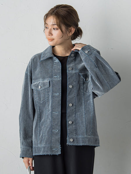 デニムにフロッキーを施し、ストーンウォッシュ加工で毛羽を落としたヴィンテージライクな表情が珍しい新鮮なデニムジャケット。加工により角度で変わる表情が他にはない1枚です。カットオフの切替え仕様にすることで軽いイメージに仕上げつつダメージ感でニュアンスをプラスしました。程良いオーバーサイズで、羽織るだけでこなれ感のあるスタイルが叶います。----------------------------------------------------------------洗濯方法家庭洗濯:液温は40℃を限度とし、手洗いができる。自然乾燥:日蔭の吊り干しがよい。アイロン:アイロン仕上げ禁止。ドライクリーニング:石油系溶剤による弱いドライクリーニングができる。----------------------------------------------------------------※画像の商品はサンプルとなりますので実際の商品と仕様、加工、サイズが若干異なる場合がございます。※お客様のモニター環境により実際のお色と多少異なる場合がございます。※撮影状況や光の当たり具合により、色合いが異なって見える場合がございます。※商品タグに記載されたサイズはヌードサイズです。実際の商品のサイズは商品情報の実寸をご確認ください。関連ワード:Droitelautreamont ドロワットロートレアモン レディース 新作 トレンド 大人フェミニン 2025秋冬 2025AW 秋冬 秋物 秋服 綿/コットン 合成繊維/ポリエステル レーヨン ポリウレタン