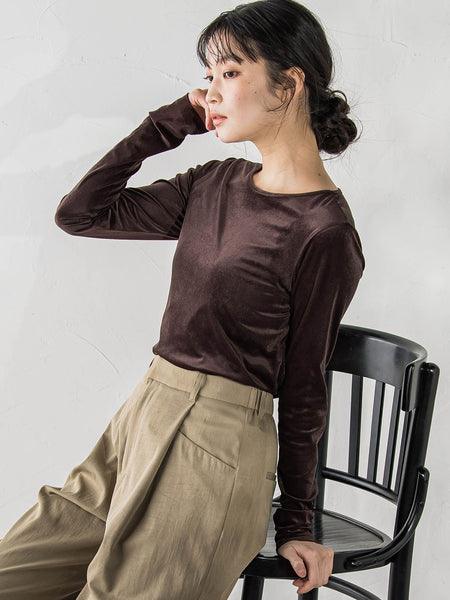 今シーズン注目の柔らかで程よい透け感と光沢のあるベロアが可愛いインナートップス。シンプルなデザインながら、ピタッとし過ぎないシルエットで体のラインを綺麗に見せてくれます。素材感は軽くて、柔らかく、光沢感を程よく抑えている為、いろいろなシーンで活躍する素材です。シアー感のあるベロアなので、一枚合わせるだけでトレンド感のあるコーディネートに仕上がります。ニット、ジャケット、ベストのインナーはもちろん、ワンピースやサロペットのインナーとしても長い時期で着用できる万能トップスです。着丈もコンパクトで、インしやすい作りになっています。----------------------------------------------------------------洗濯方法家庭洗濯:液温は40℃を限度とし、手洗いができる。自然乾燥:日蔭の吊り干しがよい。アイロン:底面温度120℃を限度としてアイロン仕上げができる。ドライクリーニング:石油系溶剤による弱いドライクリーニングができる。----------------------------------------------------------------※画像の商品はサンプルとなりますので実際の商品と仕様、加工、サイズが若干異なる場合がございます。※お客様のモニター環境により実際のお色と多少異なる場合がございます。※撮影状況や光の当たり具合により、色合いが異なって見える場合がございます。※商品タグに記載されたサイズはヌードサイズです。実際の商品のサイズは商品情報の実寸をご確認ください。関連ワード:Droitelautreamont ドロワットロートレアモン レディース 新作 トレンド 大人フェミニン 2026春夏 2026SS 春夏 春物 春服 カットソー ポリエステル ポリウレタン ベロア クルーネック 無地 長袖