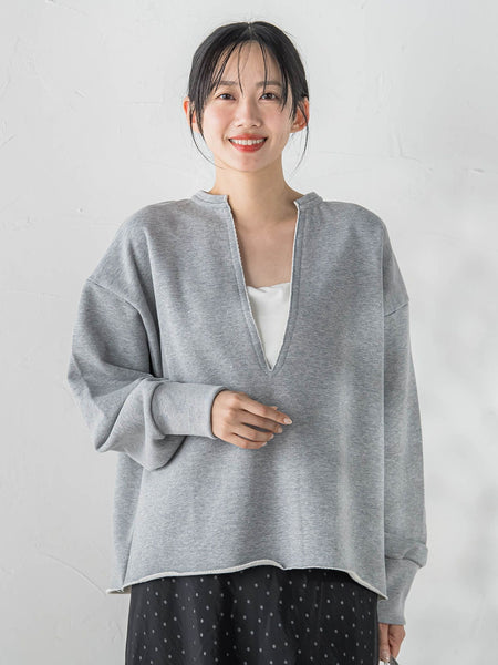 深めのVネックがポイントのリラクシーなスウェットプルオーバー。襟や裾はカットオフディティールにすることで程よい遊び心をプラスしてくれます。肩がずり落ちずにVネックのシャープ感をキープしてくれるネックライン。Tシャツをインしてこなれた着こなしを楽しんだり、キャミソールやタンクトップをインして女性らしく着こなすのもおすすめ。シャツやブラウスに合わせたり、クロップド丈を活かしてワンピースとのレイヤードも楽しめる着回し力抜群のトップスです。春らしいクリアな印象をプラスしてくれるオフホワイト、深みのあるカラーがシックな旬のブラウン、カジュアルになりがちなグレーですが、ラメ入りにすることで女性らしい印象に。国内編立・国内染色でmade in Japanにこだわった、大判手でずっしりした重量感のある存在感のある裏毛を使用しフォルムにこだわっています。【素材の特徴】【COLOR】オフホワイト・ブラウンは無地、グレーはラメ入り----------------------------------------------------------------洗濯方法家庭洗濯:液温は40℃を限度とし、手洗いができる。自然乾燥:日蔭の吊り干しがよい。アイロン:底面温度120℃を限度としてアイロン仕上げができる。ドライクリーニング:石油系溶剤による弱いドライクリーニングができる。----------------------------------------------------------------※画像の商品はサンプルとなりますので実際の商品と仕様、加工、サイズが若干異なる場合がございます。※お客様のモニター環境により実際のお色と多少異なる場合がございます。※撮影状況や光の当たり具合により、色合いが異なって見える場合がございます。※商品タグに記載されたサイズはヌードサイズです。実際の商品のサイズは商品情報の実寸をご確認ください。関連ワード:Droitelautreamont ドロワットロートレアモン レディース 新作 トレンド 大人フェミニン 2026春夏 2026SS 春夏 春物 春服 カットソー コットン ポリエステル ナイロン Vネック 長袖