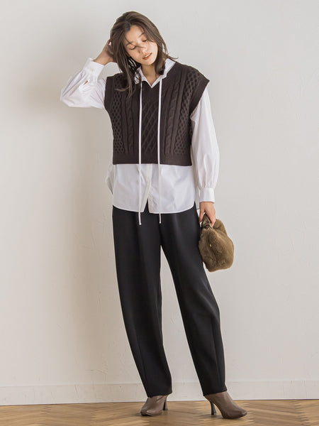 【デザインポイント・着こなしポイント】ドロワットで人気のカーブパンツが秋素材にアップデートして登場!カーブシルエットでありながら、スラックスの要素も取り入れ、きれいめスタイルにも馴染む進化したカーブパンツです。裾のダーツでさりげなくカーブラインを作っておりスタイリングに取り入れやすいシルエットです。ほんのり高めのウエストにお腹周りをダーツですっきりと仕上げ、トレンドのクロップドトップスとも相性が良いマニッシュなイメージに。新色の梳毛調のグレーが鮮度があり二重織の膨らみとマットな表情の質感が上品な素材です。ほんのりストレッチの効いた、穿き心地の良い素材で、後ろウエストのゴムもストレスフリーな穿き心地です。----------------------------------洗濯方法家庭洗濯:液温は40℃を限度とし、洗濯機で弱い洗濯ができる。自然乾燥:日蔭の吊り干しがよい。アイロン:底面温度110℃を限度としてアイロン仕上げができる。ドライクリーニング:石油系溶剤による弱いドライクリーニングができる。----------------------------------※画像の商品はサンプルとなりますので実際の商品と仕様、加工、サイズが若干異なる場合がございます。※お客様のモニター環境により実際のお色と多少異なる場合がございます。※撮影状況や光の当たり具合により、色合いが異なって見える場合がございます。※商品タグに記載されたサイズはヌードサイズです。実際の商品のサイズは商品情報の実寸をご確認ください。関連ワード:Droitelautreamont ドロワットロートレアモン AW 2024秋冬 秋 秋服 大人カジュアル 10分丈 ポリエステル カジュアル 無地 セレモニー オフィス