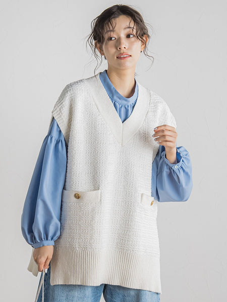 【デザインポイント・着こなしポイント】冬のスタイルに華やかさをプラスしてくれるツイード調ニットのベスト。ブークレヤーンや膨らみのある糸など、異なる糸をミックスさせ色味に奥行きがあるツイード調に編み立てました。すっきりとしたVネックに抜け感のあるオーバーシルエットでレイヤードしやすいバランスに。ナロースカートスカートやワイドパンツとも好相性です。----------------------------------洗濯方法家庭洗濯:液温は40℃を限度とし、手洗いが出来る。自然乾燥:日蔭の平干しが良い。アイロン:底面温度110℃を限度としてアイロン仕上げができる。ドライクリーニング:石油系溶剤による弱いドライクリーニングができる。----------------------------------※画像の商品はサンプルとなりますので実際の商品と仕様、加工、サイズが若干異なる場合がございます。※お客様のモニター環境により実際のお色と多少異なる場合がございます。※撮影状況や光の当たり具合により、色合いが異なって見える場合がございます。※商品タグに記載されたサイズはヌードサイズです。実際の商品のサイズは商品情報の実寸をご確認ください。関連ワード:Droitelautreamont ドロワットロートレアモン AW 2024秋冬 冬 冬服 WINTER 大人カジュアル ベスト ニット コットン ポリエステル ナイロン Vネック ノースリーブ ツイード調