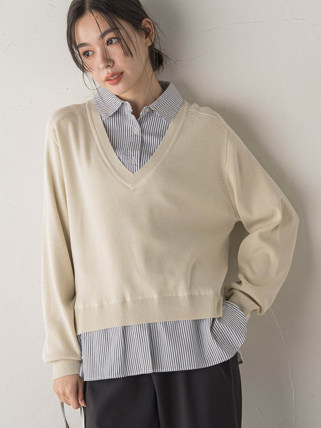 シャツとニットがセットになったレイヤードアイテム。Vネックですっきりとした印象で、トレンド感のあるスタイリングが簡単に叶います。ニットはレーヨン混で柔らかく、シャツはポリエステル×綿素材で快適な着心地。ハンドウォッシャブル対応でお手入れも簡単です。カラーはアイボリー×ストライプ、グレー×サックス、ネイビー×ストライプの3色展開です。----------------------------------------------------------------洗濯方法家庭洗濯:液温は40℃を限度とし、手洗いができる。自然乾燥:日蔭の平干しがよい。アイロン:底面温度120℃を限度としてアイロン仕上げができる。ドライクリーニング:石油系溶剤による弱いドライクリーニングができる。----------------------------------------------------------------※画像の商品はサンプルとなりますので実際の商品と仕様、加工、サイズが若干異なる場合がございます。※お客様のモニター環境により実際のお色と多少異なる場合がございます。※撮影状況や光の当たり具合により、色合いが異なって見える場合がございます。※商品タグに記載されたサイズはヌードサイズです。実際の商品のサイズは商品情報の実寸をご確認ください。関連ワード:Droitelautreamont ドロワットロートレアモン レディース 新作 トレンド 大人フェミニン 2025秋冬 2025AW 秋冬 冬物 冬服 ニット コットン ポリエステル レーヨン アクリル Vネック 無地 ストライプ 長袖 ポリエステル ゴム