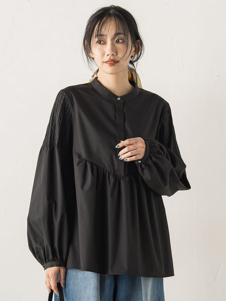 袖山のピンタックがポイントのボリュームスリーブブラウス。