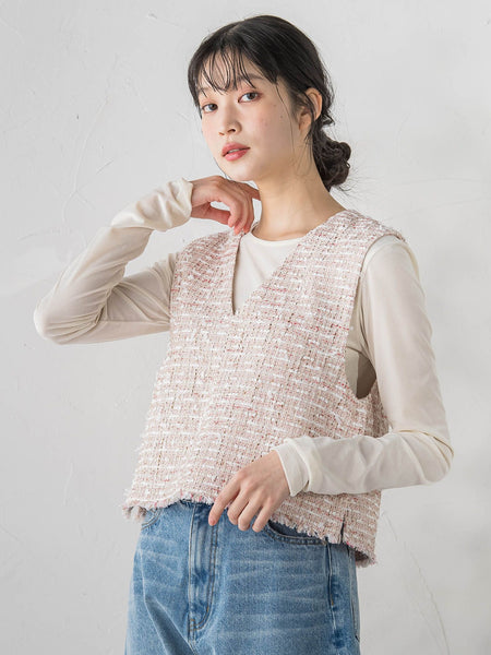 日本一のウール産地である尾州産のツィード素材を使用しています。通常より長めのスラリット糸と、スラブの意匠糸をふんだんに使用することにより、表情豊かで独特な高級感のあるツィードに仕上がっています。春らしいカラーや長めの羽モールのスラリット糸で顔周りも華やかになり、一枚で主役になるツィードベストになります。裏地は高級感のあるサテン生地を使用しており、肌触りも滑らかにご着用していただけます。ショート丈なのでコンサバになりすぎず、フォーマルなシーンから普段使いまで幅広くご着用いただけます。また程よい肉感で春先から冬まで中のインナーを変え様々な着回しができます。----------------------------------------------------------------洗濯方法家庭洗濯:液温は30℃を限度とし、洗濯機で非常に弱い洗濯ができる。自然乾燥:日蔭の吊り干しがよい。アイロン:底面温度120℃を限度としてアイロン仕上げができる。ドライクリーニング:石油系溶剤による弱いドライクリーニングができる。----------------------------------------------------------------※画像の商品はサンプルとなりますので実際の商品と仕様、加工、サイズが若干異なる場合がございます。※お客様のモニター環境により実際のお色と多少異なる場合がございます。※撮影状況や光の当たり具合により、色合いが異なって見える場合がございます。※商品タグに記載されたサイズはヌードサイズです。実際の商品のサイズは商品情報の実寸をご確認ください。関連ワード:Droitelautreamont ドロワットロートレアモン レディース 新作 トレンド 大人フェミニン 2026春夏 2026SS 春夏 春物 春服 ジレ コットン ポリエステル レーヨン アクリル ポリウレタン Vネック 無地 ノースリーブ