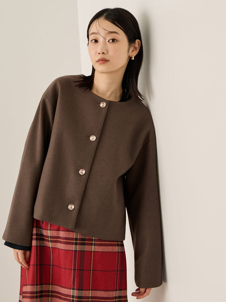 ●POINTピュアウールのような温かみのあるソフトな肌触りとカットソー素材のイージーさを併せ持つウールライクなファブリックを使用しています。コンパクトに見えるフォルムながら、ドロップショルダーで動きやすさや着合わせやすさを考慮したデザインになっています。配色見えの裏地を使用して、ちらりと見えたときにのポイントに。アンティーク調のメタルボタンがリッチな印象をプラスします。ペプラムシルエットなどヘム変化のあるトップスにあわせたり、ワイドパンツやフレアスカートなど、ボリュームのあるボトムスとあわせていただくのがおすすめです。季節の移行期におすすめのジャケット以上コート未満のライトアウターです。----------------------------------透け感:なし厚さ: やや厚い伸縮性:あり裏地: ありポケット: あり--------------------------------------------------------------------------------------------------洗濯方法家庭洗濯:家庭での洗濯禁止。アイロン:底面温度160℃を限度としてアイロン仕上げができる。ドライクリーニング:石油系溶剤による弱いドライクリーニングができる。----------------------------------------------------------------■モデル身長 165cm 着用サイズ M※画像の商品はサンプルとなりますので実際の商品と仕様、加工、サイズが若干異なる場合がございます。※お客様のモニター環境により実際のお色と多少異なる場合がございます。※撮影状況や光の当たり具合により、色合いが異なって見える場合がございます。関連ワード:ketty ケティ レディース 新作 大人コーデ 2025秋冬 2025AW 秋冬 秋物 秋服 ショート丈 合成繊維/ポリエステル レーヨン オフィス 旅行 デート 通勤 ホテルディナー アフタヌーンティー