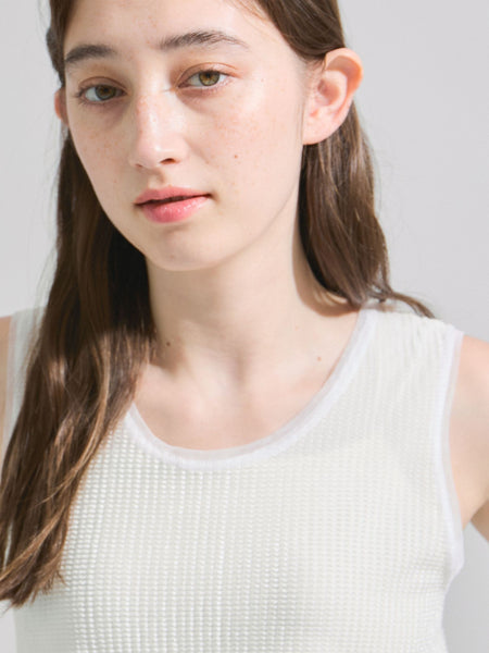連続した細やかな柄織りが特徴で、軽さをだしたミニドビー素材をボディに使用し、ネック・アームラインをシアーチュール素材で切り替えニュアンスのある首元を演出するノースリーブトップスです。