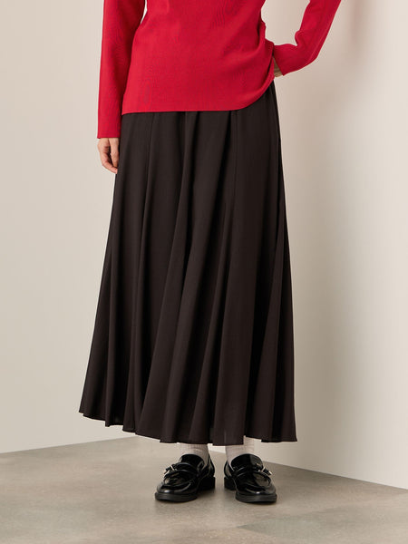 ウエストはぐるりゴム仕様、ウエストからギャザーが入ってイージーな履き心地ですが、動くたびに膝上から裾に向かって広がり、軽やかに揺れるフローイングシルエットが美しい一枚です。