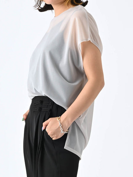●POINT大人なほんのりシアーのトップス。程よくラフに着こなせる、シアーアイテムはヘルシーに肌見せが◎お尻の隠れる丈感に、フレンチスリーブで、体型カバーで着るのも嬉しいポイント。●COORDINATEインナーにはタンクトップや、キャミソールを合わせて。アウトスタイルでもシアー感が軽やかで、ワイドボトムにもマッチ。----------------------------------透け感: あり厚さ: 薄い通伸縮性: あり裏地: なしポケット: なし--------------------------------------------------------------------洗濯方法家庭洗濯:液温は40℃を限度とし、手洗いが出来る。自然乾燥:日蔭の吊り干しがよい。アイロン:底面温度110℃を限度としてアイロン仕上げができる。ドライクリーニング:石油系溶剤による弱いドライクリーニングができる。----------------------------------※画像の商品はサンプルとなりますので実際の商品と仕様、加工、サイズが若干異なる場合がございます。※お客様のモニター環境により実際のお色と多少異なる場合がございます。※撮影状況や光の当たり具合により、色合いが異なって見える場合がございます。